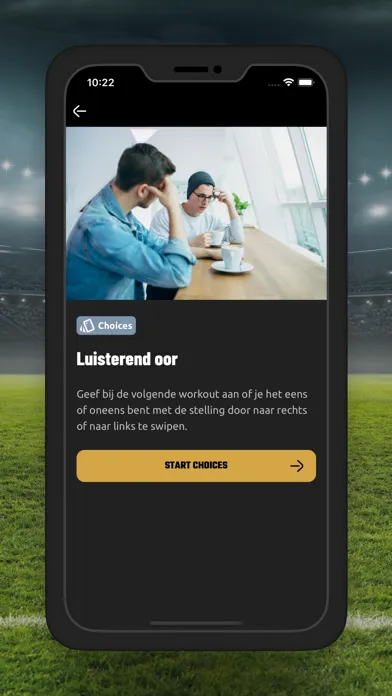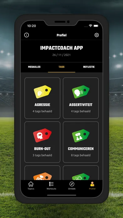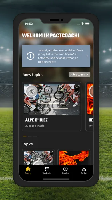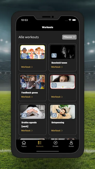 Na het invullen van een statuscheck krijg je een aantal topics aangeboden die voor jou op dat moment belangrijk zijn. Elke topic heeft meerdere workouts, choices, tips en challenges. door het behalen van een workout verzamel je tags en medailles die je succes laten zien.