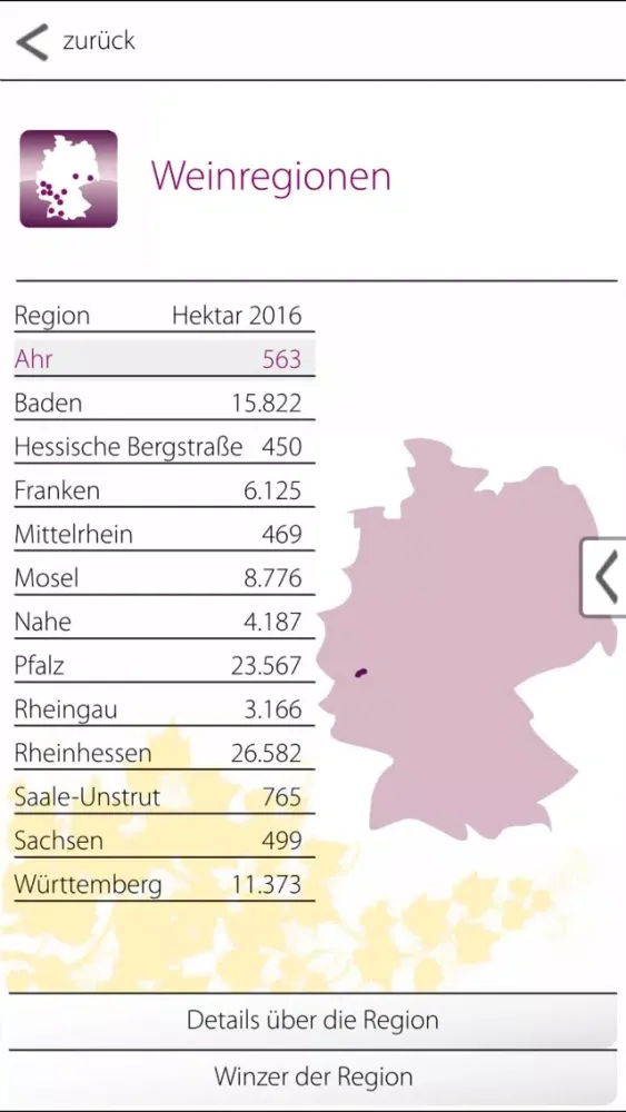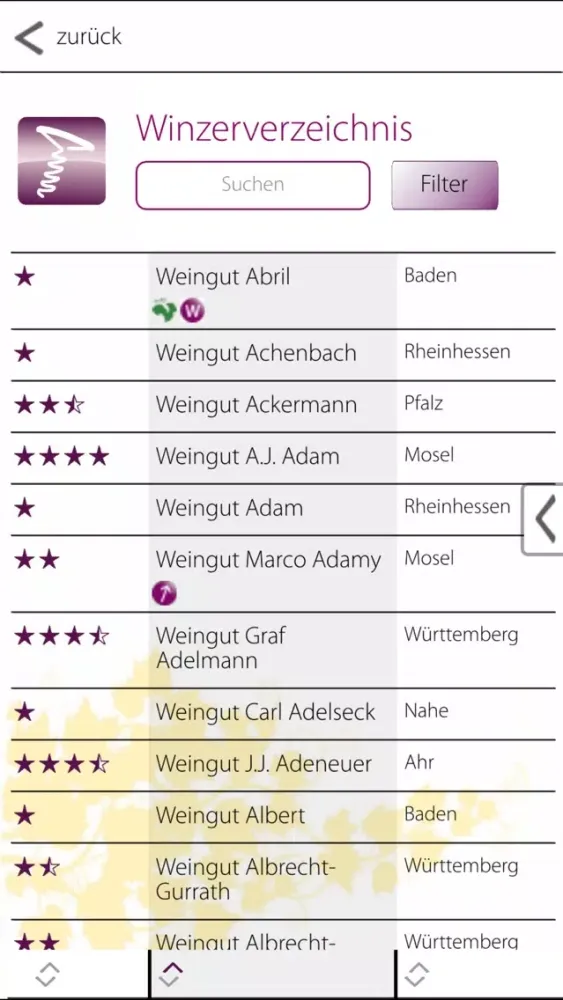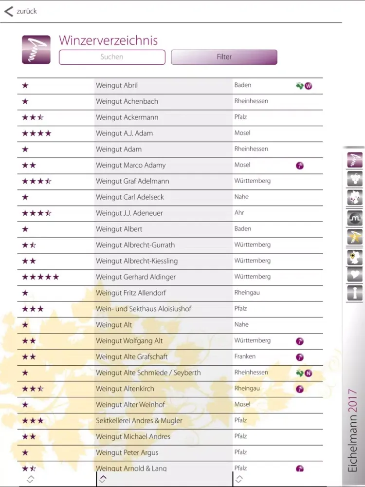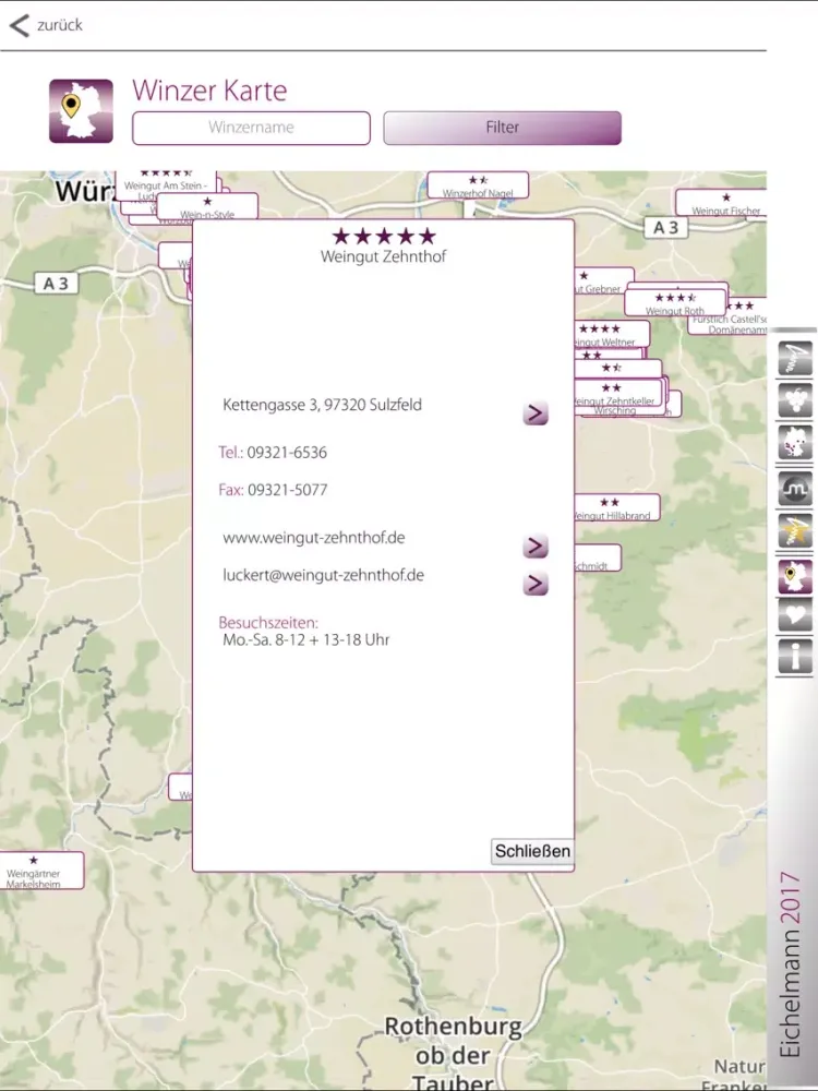 Neu in der Eichelmann-App 2017 ist die "Winzer-Karte": Bei der Suche nach einem Winzer werden auf einer Karte alle Winzer angezeigt, die sich in der Nähe befinden, sowie deren Kontaktdetails (auch hier sind die Filterfunktionen anwendbar).