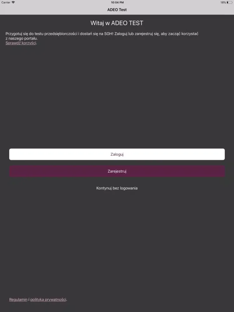 ADEO test to aplikacja, pomagająca uczniom przygotować się do testu z przedsiębiorczości w ramach rekrutacji do Szkoły Głównej Handlowej (SGH) na studia licencjackie.
