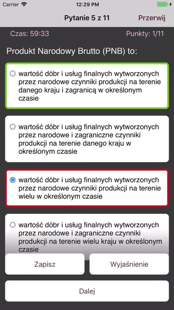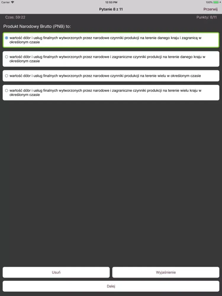 Nasze materiały edukacyjne będą przydatne zarówno dla osób, które rozpoczęły już naukę do testu (np. poprzez e-learning, czytanie książek, uczestnictwo w kursach), jak i dla osób mniej zaawansowanych. Nauka poprzez naszą aplikację może przebiegać dwutorowo. Tryb test pozwoli Ci sprawdzić i utrwalić dotychczasową wiedzę poprzez rozwiązywanie testów wylosowanych przez nasz algorytm – zawierają one zagadnienia z każdego działu. Tryb nauka podzielony jest na 5 głównych działów, które są odwzorowaniem zagadnień przedstawionych przez uczelnię SGH. Pozwala to na naukę wszystkich zagadnień po kolei i przyswojenie całej wiedzy potrzebnej do zdobycia 100 punktów w procesie rekrutacji na uczelnie.