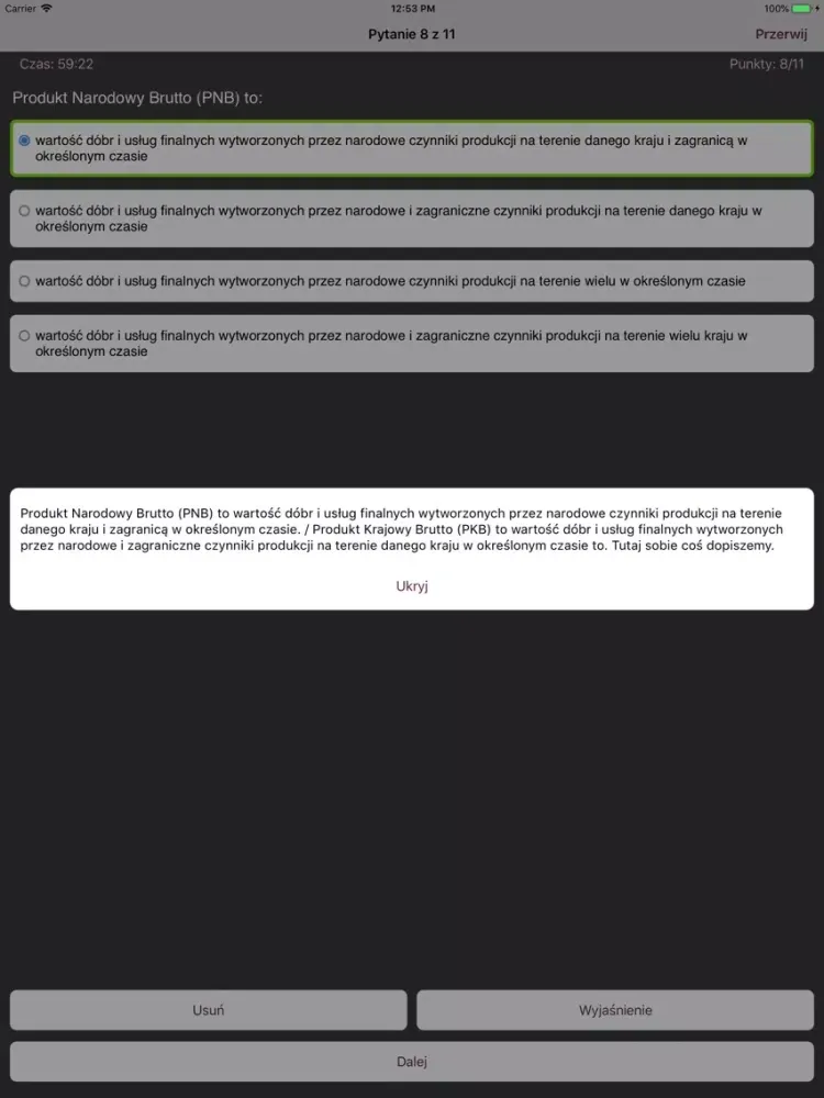 Wybrana formuła nauki została przez nas przetestowana i skonsultowana z uczniami o różnym poziomie zaawansowania posiadanych wiadomości. Jednocześnie nauka poprzez rozwiązywanie testów oraz czytanie wyjaśnień jest efektywną metodą na szybkie i trwałe pozyskanie wiedzy. A do tego można to robić gdzie i kiedy chcesz, niezależnie od tego, czy na naukę możesz przeznaczyć 5 godzin, czy 5 minut!