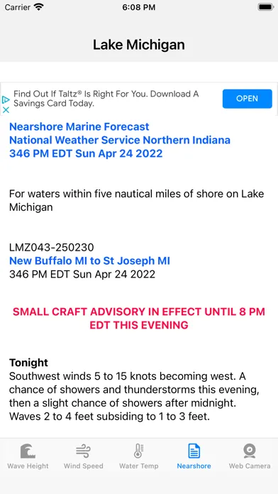 Data is pulled from the NOAA (National Oceanic and Atmospheric Administration) Marine Forecast database. View predicted Wave Height, Wind Speed, Water Surface Temperature, and Nearshore Forecasts. View webcam images along the lake. For webcam and App suggestions, please contact me though the support link.