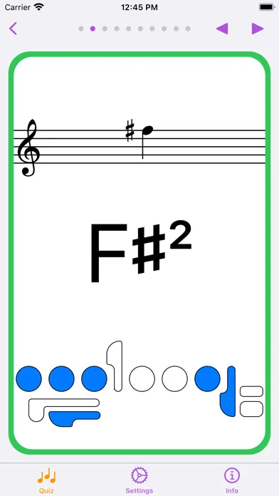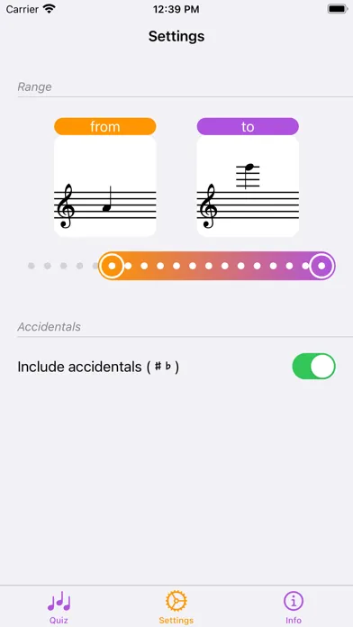 In order to adapt the quizzes to the proficiency of the user, the range of notes and the use of accidentals (sharp, flat) can be adjusted.