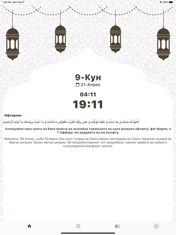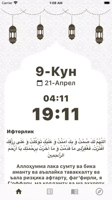 Ramazon taqvimi ramazon oyida og'iz ochish va yopish vaqtlarini ko'rishda va qiblani topshda foydalanishingiz mumkin