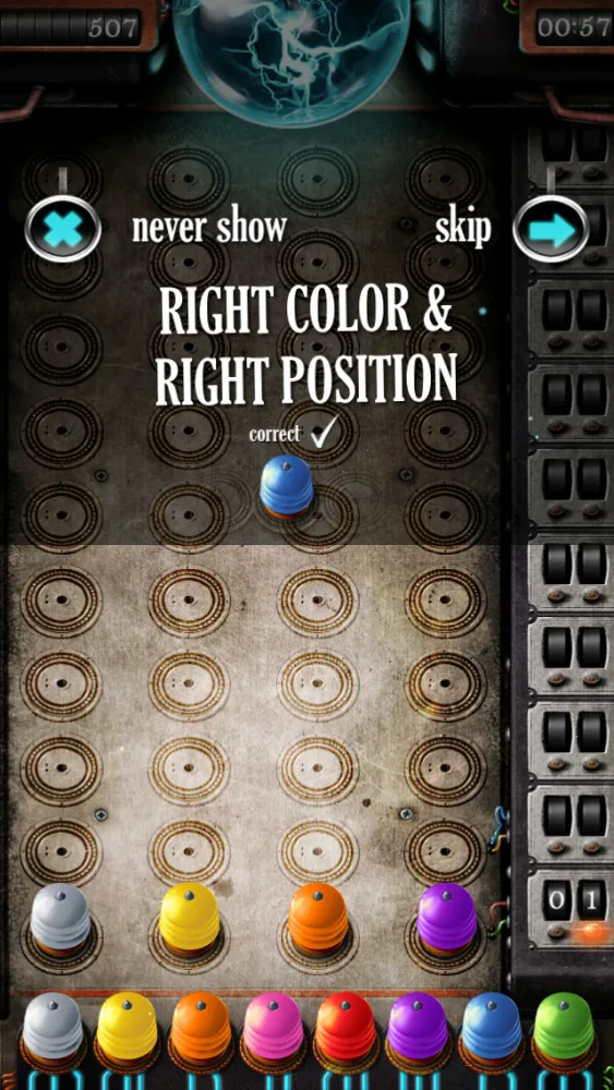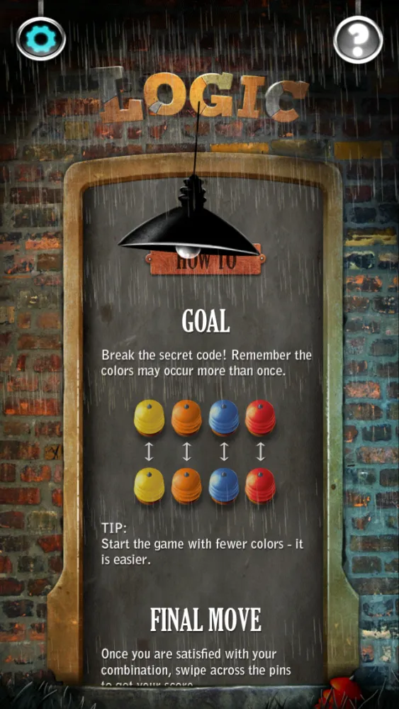 The player tries to guess the pattern, in both order and color, within ten turns. Each guess is made by placing a row of code pegs on the decoding board. Once placed, the iPhone provides feedback by placing from zero to four key pegs in the small holes of the row with the guess. A colored or black key peg is placed for each code peg from the guess which is correct in both color and position. A orange key peg indicates the existence of a correct color code peg placed in the wrong position.