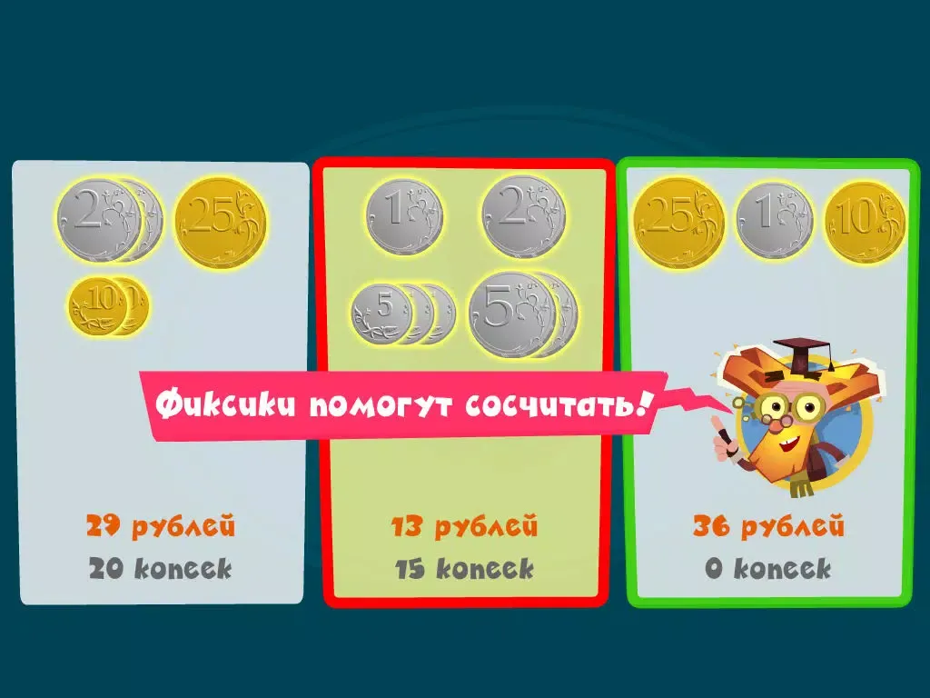 В игре "Копилка" фиксики учат малышей... считать деньги! Знакомимся с понятием "номинал", учимся пересчитывать не количество монет, а их стоимость, развиваем математические способности, смекалку и логику - готовимся к школе!