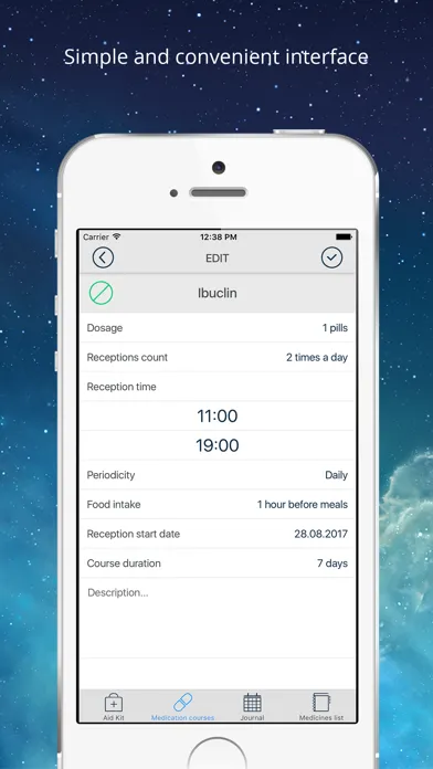 - In magazine, you can keep track of all the courses on the reception date and time, as well as receive notifications of missed medications.