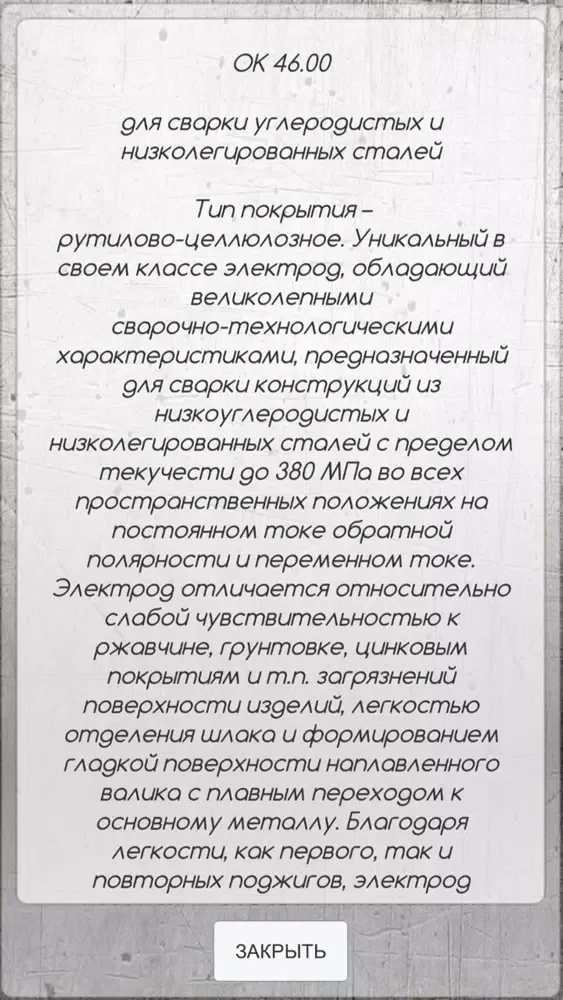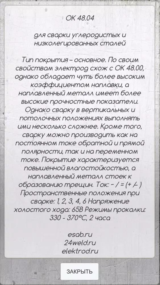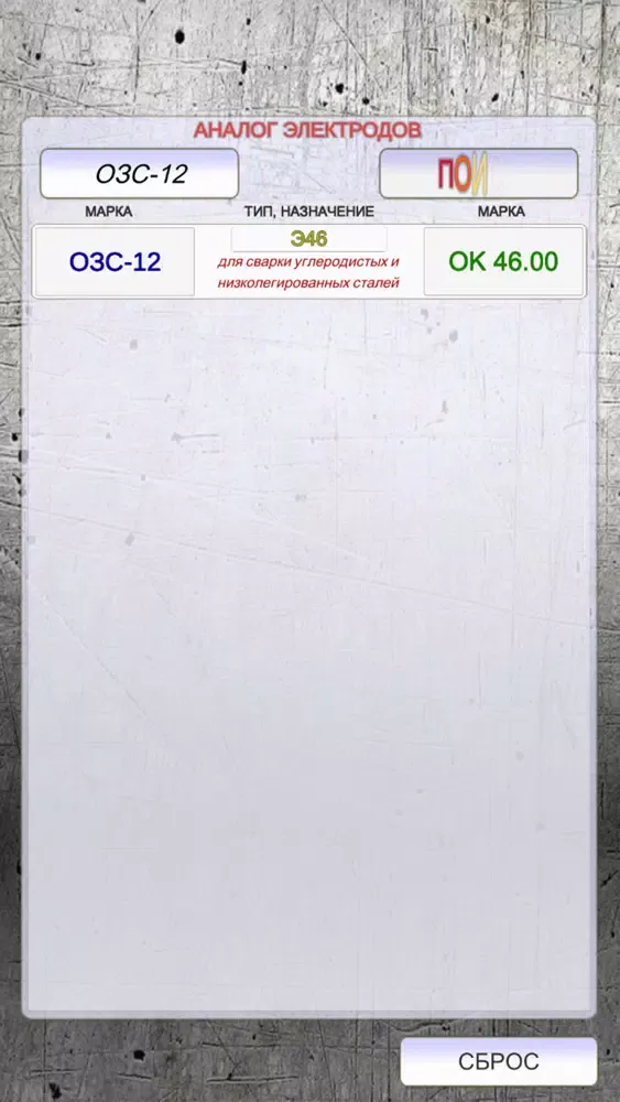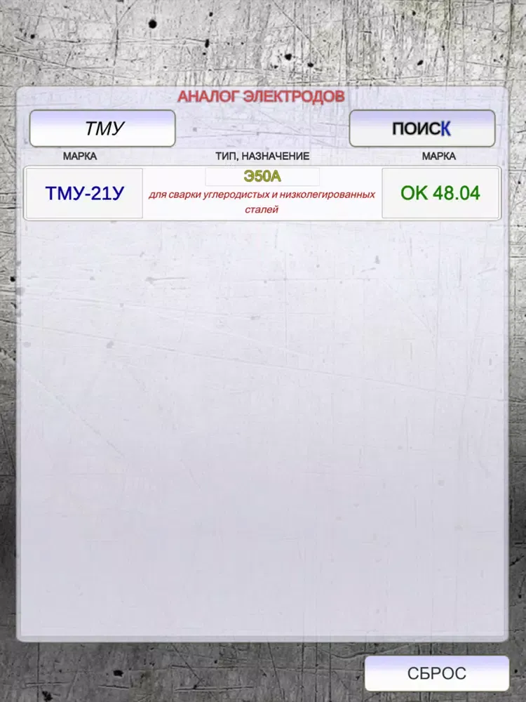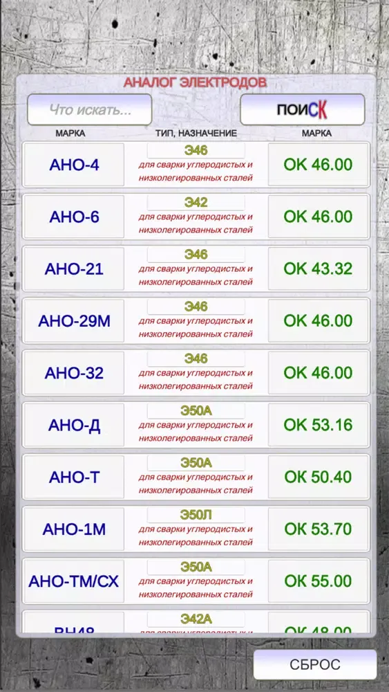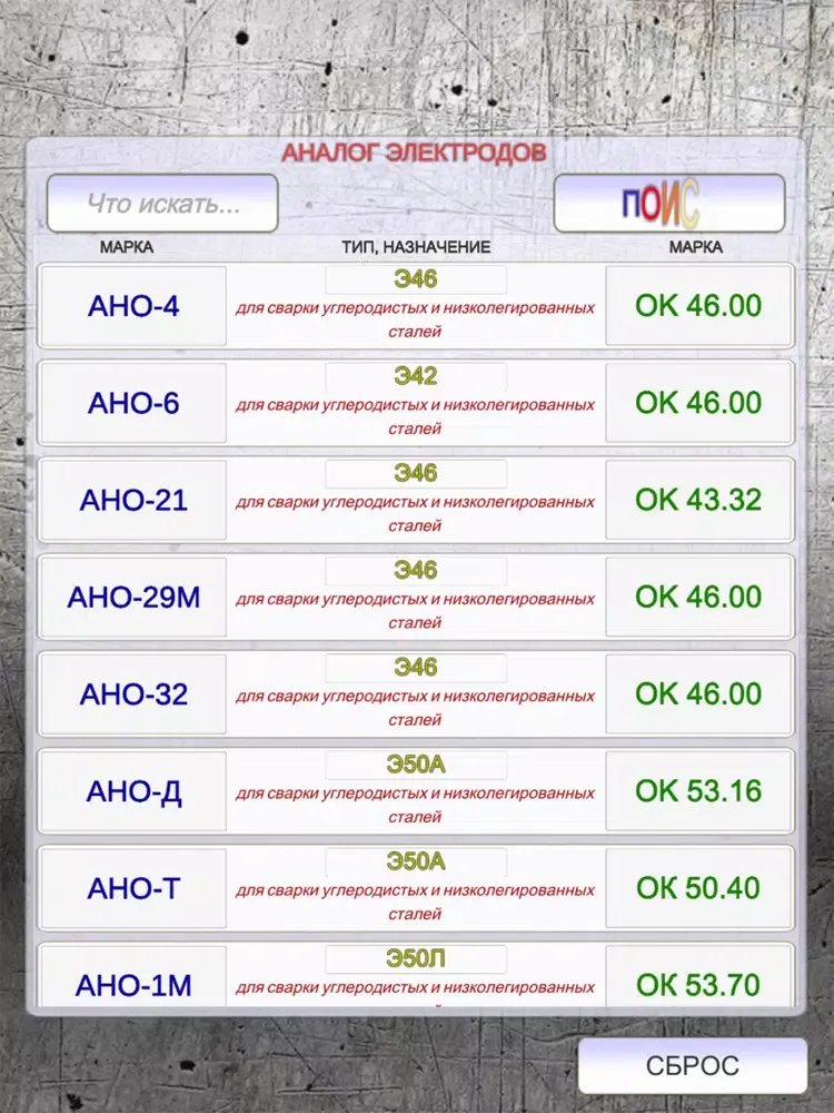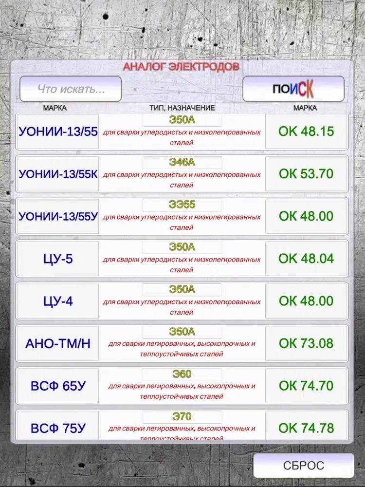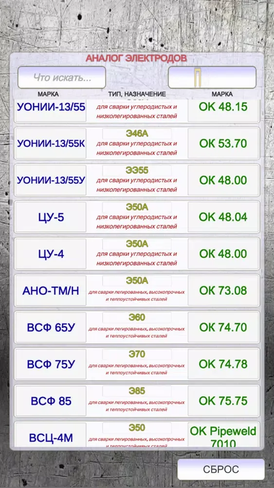 приложение для подбора и замены электродов для ручной дуговой сварки. характеристики, назначение электродов. офлайн. быстрый поиск по марке электрода подбор аналога.