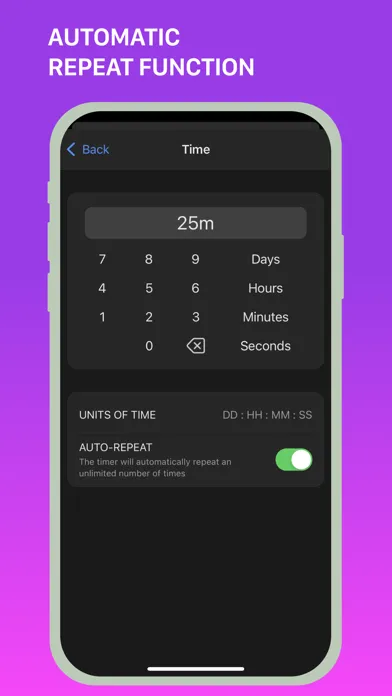 Set timer start delays, add or subtract time from running timers, and choose the "Auto-repeat" option for automatic timer restart.