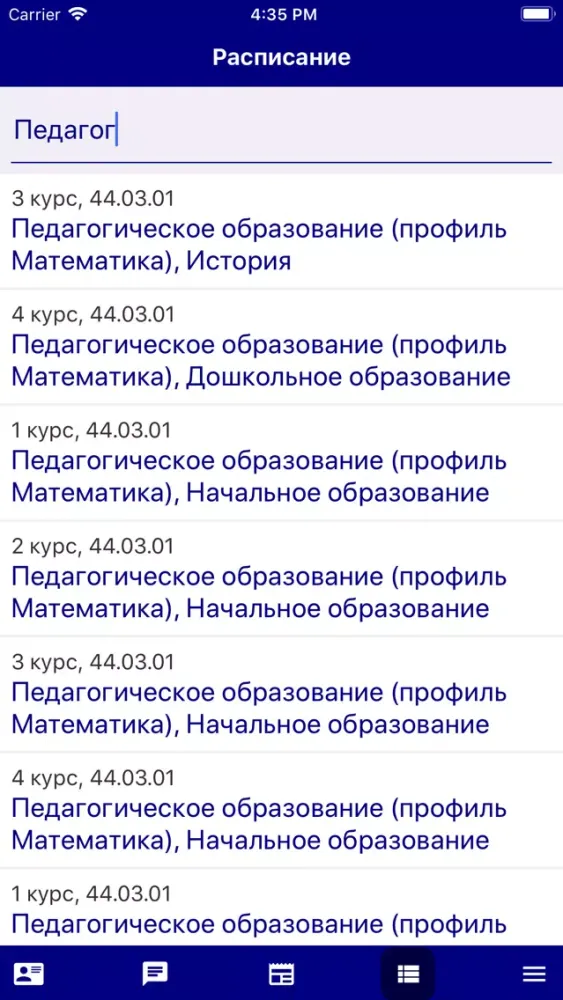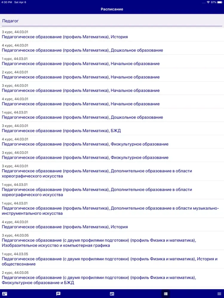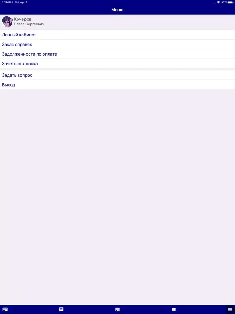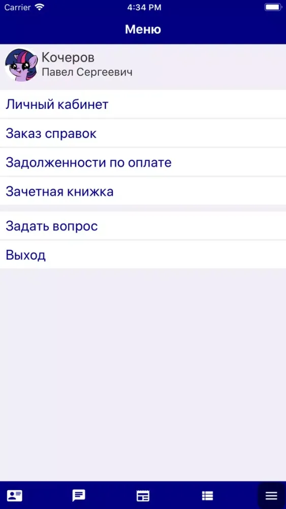 - обучению (направление подготовки, профиль, форма обучения, курс, группа; данные зачетной книжки; расписание);
