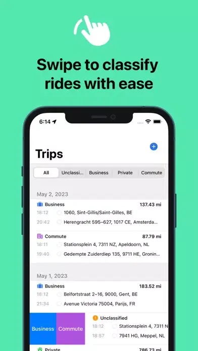 ▶ EASY TRIP CLASSIFICATION: Classifying your trips is a breeze. You can easily categorize trips as zakelijk, privé, or woon-werkverkeer (business, personal, or commuting) with a simple swipe, streamlining your mileage management.