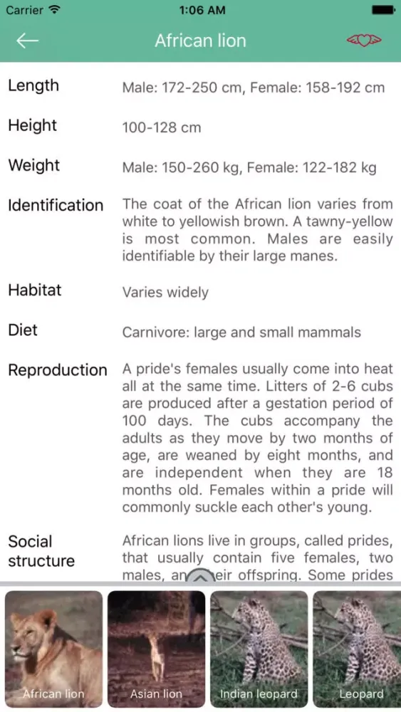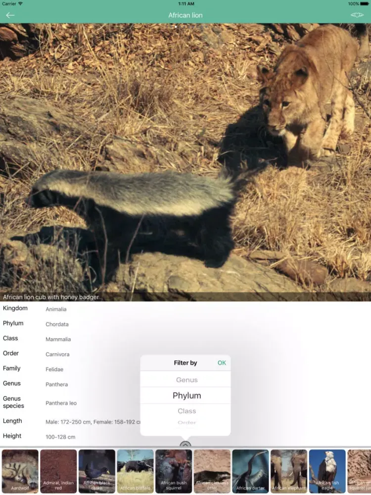 Animal Pictures and Facts is a comprehensive guide (app) to the exciting world of animals. Here you can learn all about animals. The Animal Encyclopedia (app) is organized by taxonomy - mammals, birds, reptiles, amphibians, fishes, and invertebrates, further sub divided into families (Apes, Elephants, Whales Etc.). Each individual animal entry gives you a fascinating photograph and details as much interesting information as possible on their habitat, geographic location, size, lifespan, and conservation status. Each entry also contains the common names and scientific names.