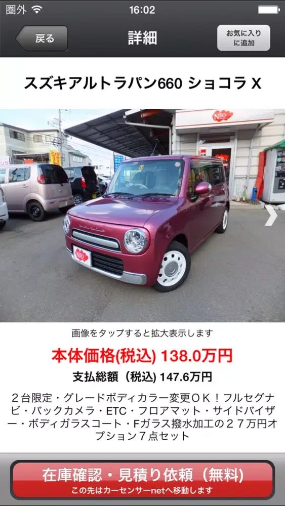 中古車情報をお気に入りに追加出来ます。