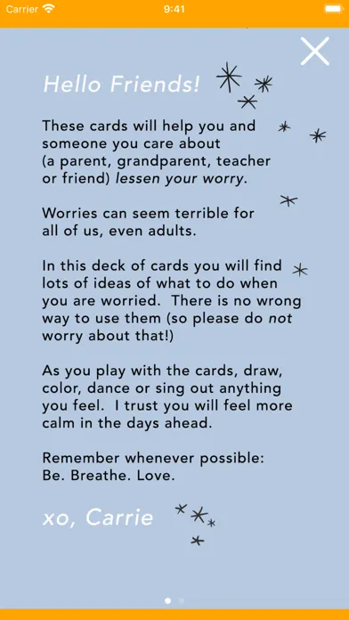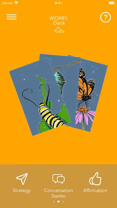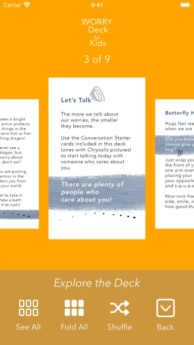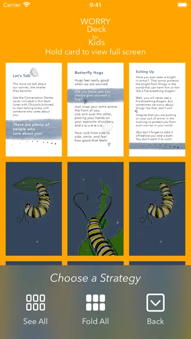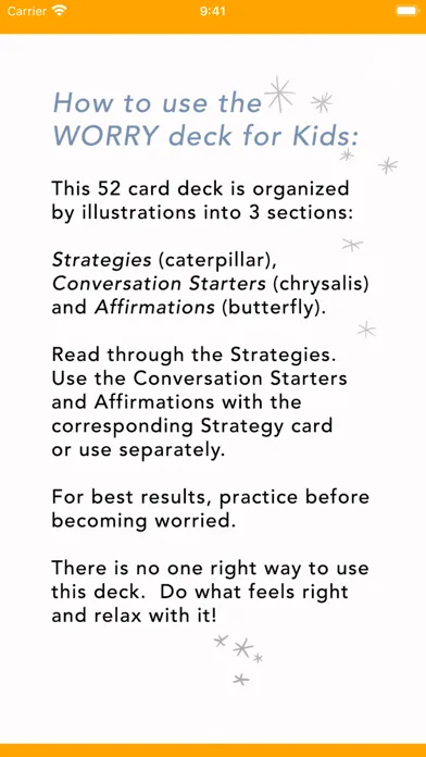The free version of this app will give you 3 Strategies, 2 Conversation Starters to get you and your child talking about their worry, and 3 Affirmations. Your child will be able to explore, favorite and journal within the app and if you and she/he like what you see you will have the option to unlock all 52 cards for a ONE TIME purchase price.