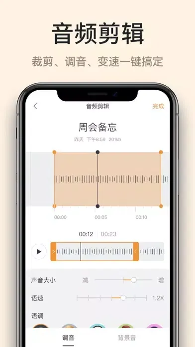 - 一键剪辑音频、语速语调调音、音频添加背景音、淡入淡出等