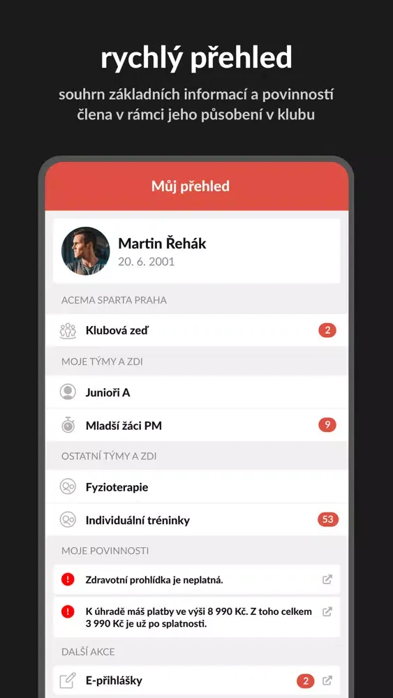 - notifikace na události, platby a další povinnosti