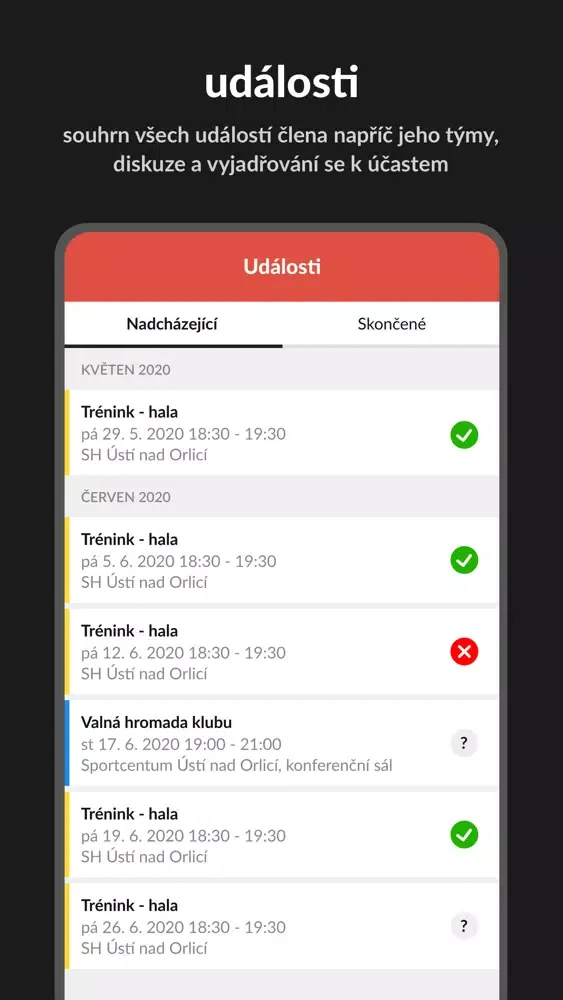 - přehled událostí a vyjadřování účasti