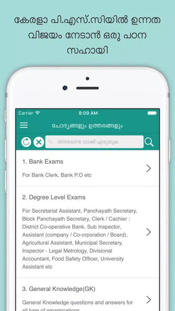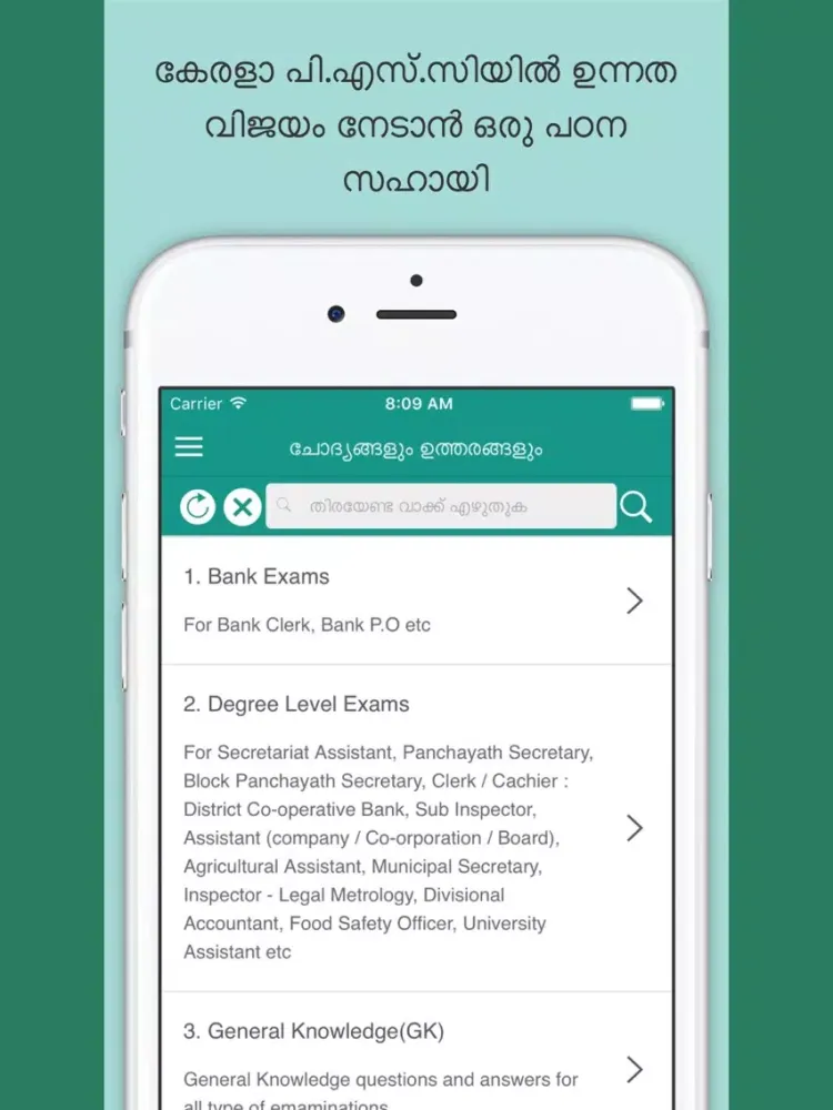 Kerala PSC App is suitable for Bank Exams(For Bank Clerk, Bank P.O etc), Degree Level Exams(For Secretariat Assistant, Panchayath Secretary, Block Panchayath Secretary, Clerk / Cashier : District Co-operative Bank, Sub Inspector, Assistant (company / Co-orporation / Board), Agricultural Assistant, Municipal Secretary, Inspector - Legal Metrology, Divisional Accountant, Food Safety Officer, University Assistant etc), English General Knowledge GK(General Knowledge questions and answers for all type of examinations), SSLC Level Exams(For LD Clerk, Civil Police Officer, Forest Guard, Jail Warden, Forest Ranger, Excise Guard, Fireman, Mail Warden, Lab Assistant, KSRTC Conductor, Computer Assistant etc), English(English Questions and Answers for Kerala PSC exams), Malayalam General Knowledge(Malayalam GK) etc