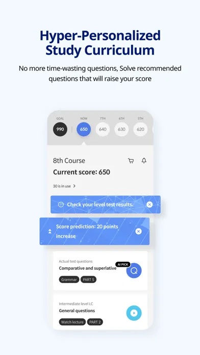 It will analyze your weaknesses by Part (Listening, vocabulary, grammar, etc.) and recommend a personalized study to increase your score in the fastest period.