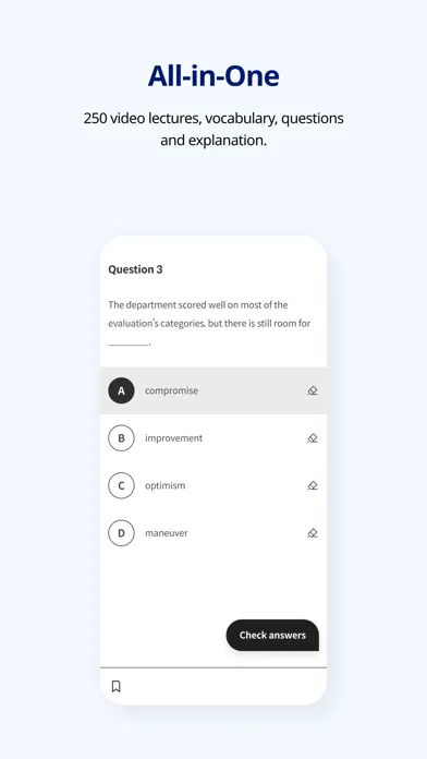 Experience everything about TOEIC with Santa - from 8,000 TOEIC problems that reflect the analysis of the latest TOEIC trend to 450 TOEIC lectures and 1,000 TOEIC vocabulary.