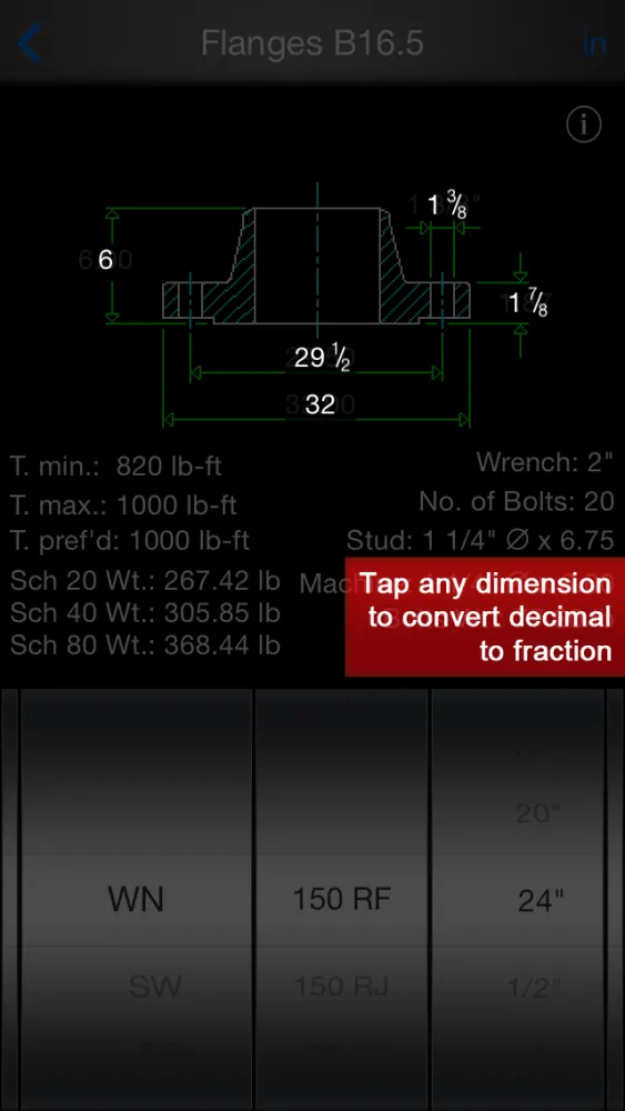 When in inches units, display shows decimal inch. To view in fraction, tap any dimension and will reveal the inch fraction equivalent.