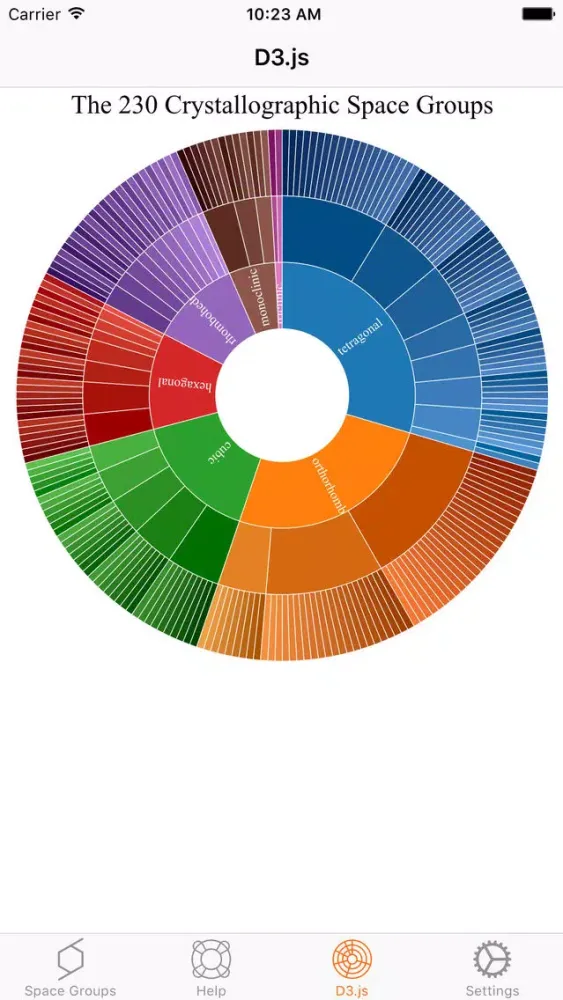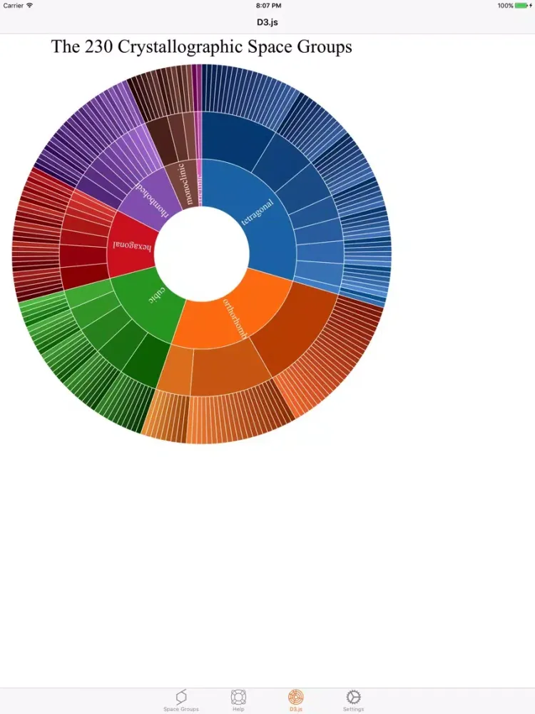 Interactive visualization of the data hierarchy of the 7 crystal systems, 32 crystallographic point groups, and 230 crystallographic space groups.