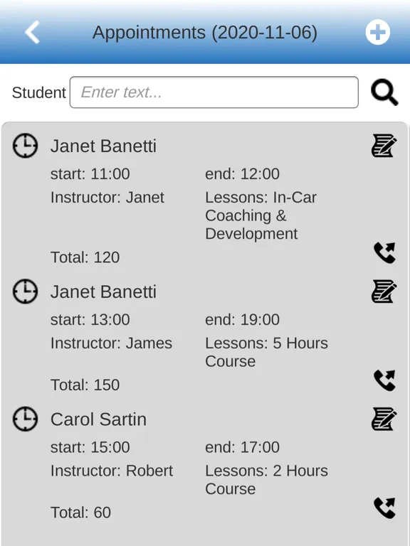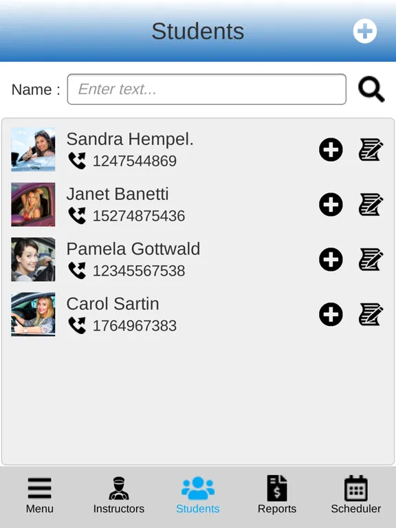 The Students section stores in all info of the students that are being taught at the driving institute. This information includes residence and mobile numbers and email, home and work addresses. Also the provision of calling any student or making a phone call from the program is offered.