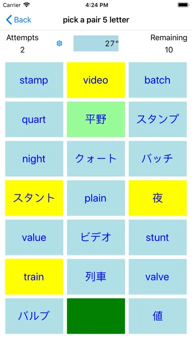 A tiny pick a pair app that helps you along, with learning the basics of Japanese. Containing 1, 2, 3, and 4 (free), 5, 6, 7, 8 and 9 letter (paid for) English words translated to Japanese for you to play at pick a pair. Test your self on the go!