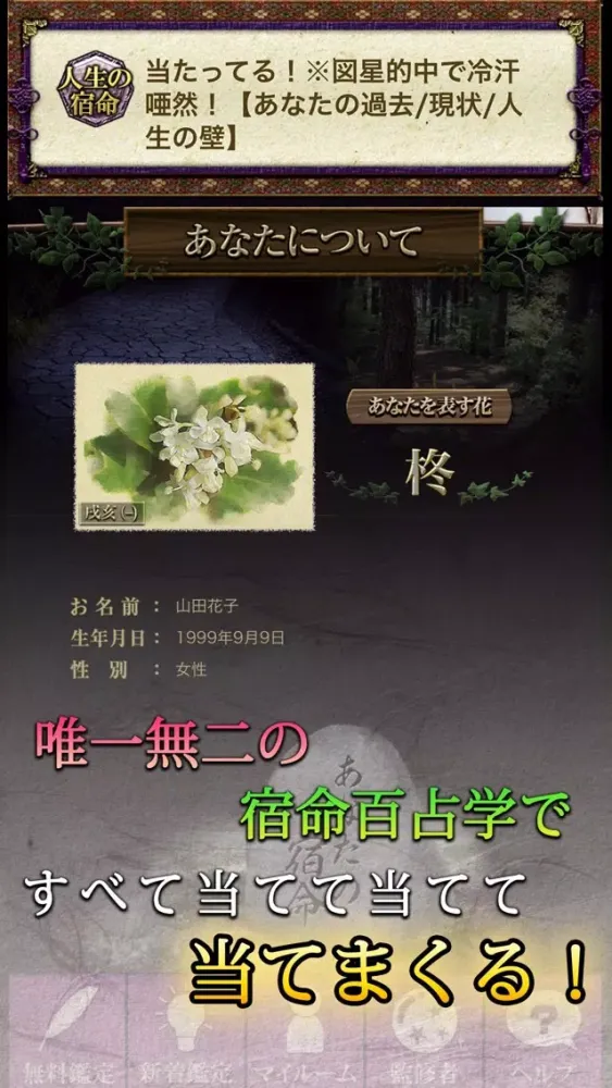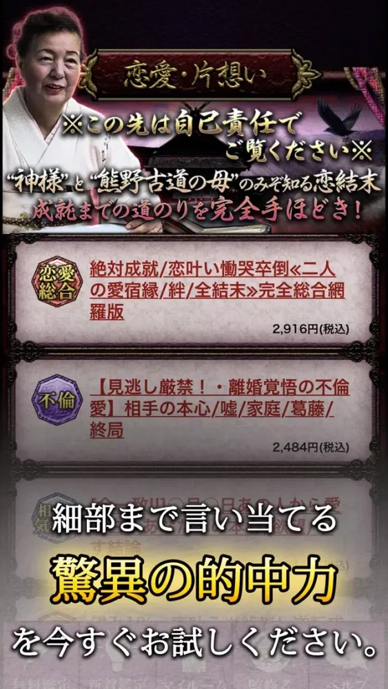 ・有料でご購入されたメニューは【マイルーム】の【鑑定履歴】からご確認いただけます。