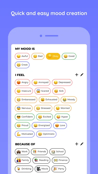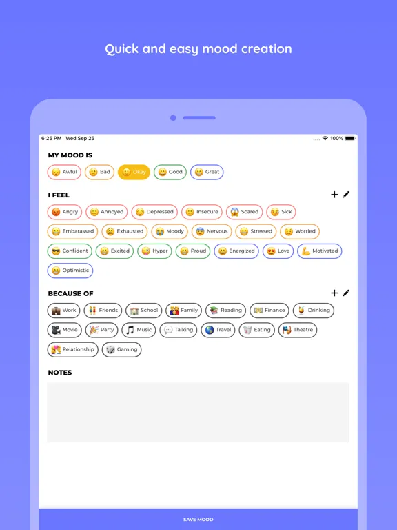 -Super quick way to add new moods and attach emotions, activities and notes to it