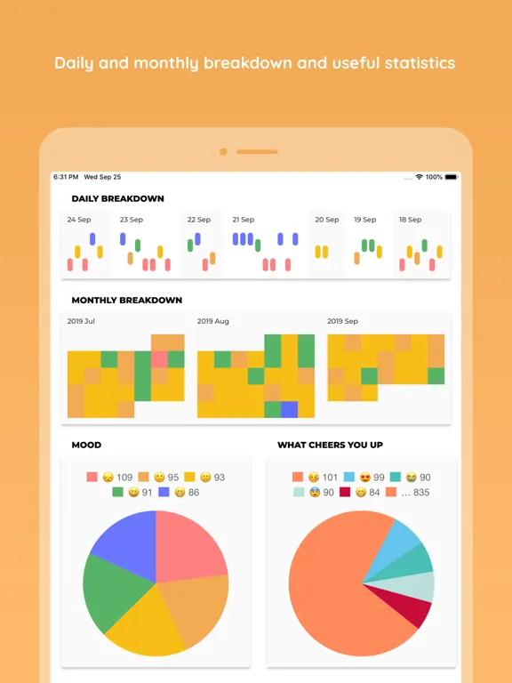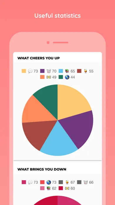 -Statistics of your top moods, top emotions, top activities, activities that bring you down and activities that cheer you up