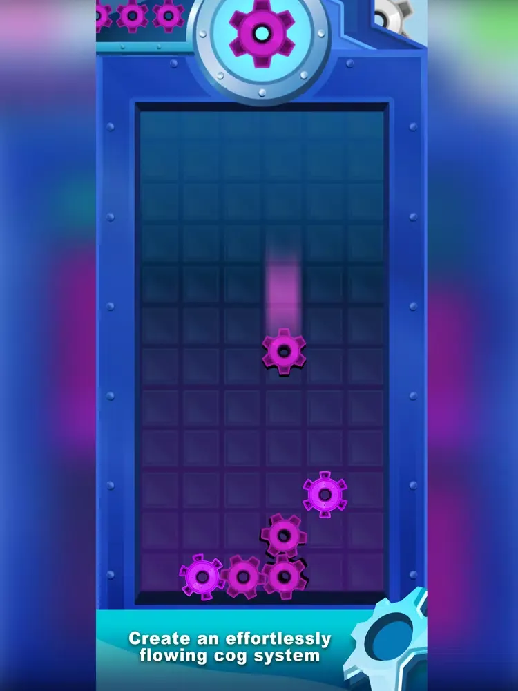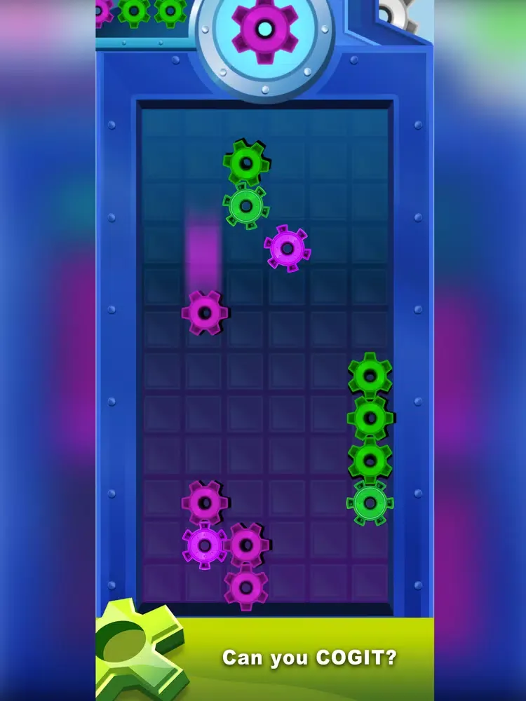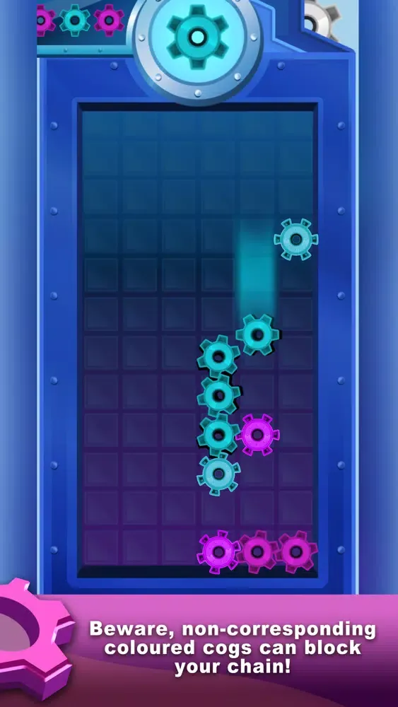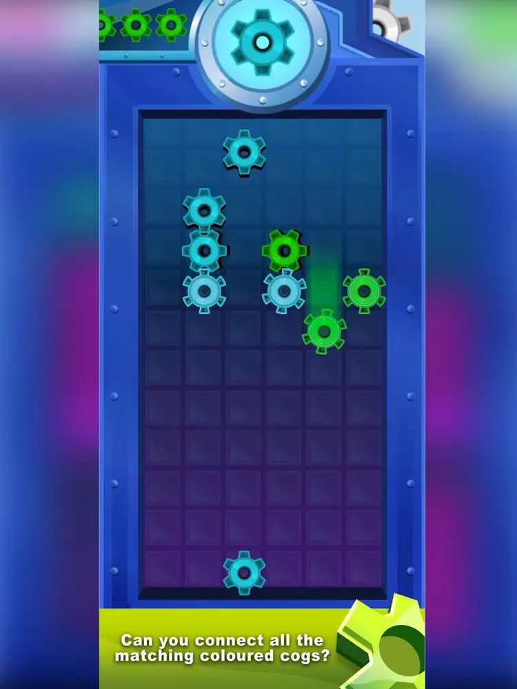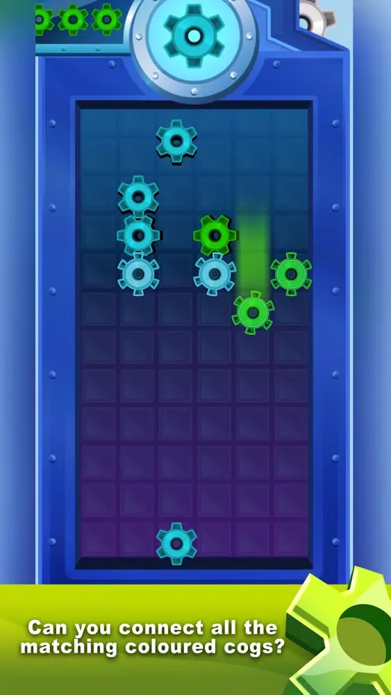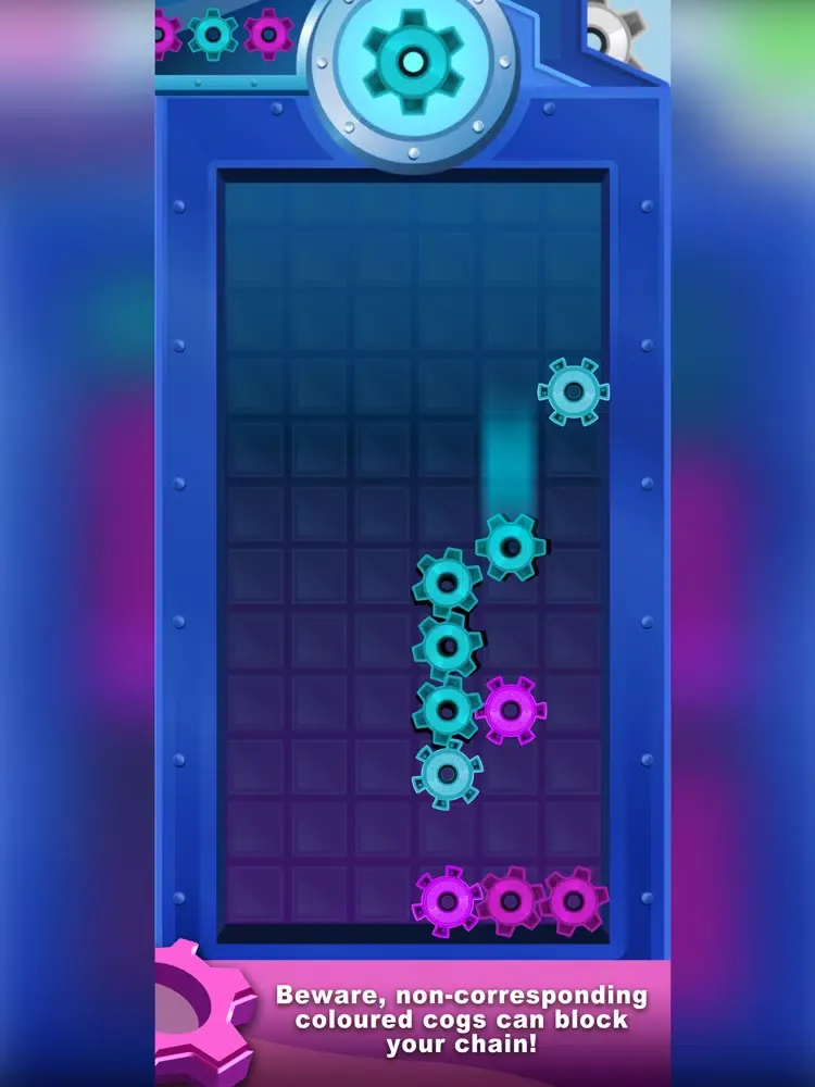 Drop, stack and align more cogs of the same colour in any direction possible to create a chain between the two spinning/functioning cogs. Once you have connected the two spinning cogs, you’ve mastered that level! Beware, non-corresponding coloured cogs can block your chain. As the levels get harder, different coloured cogs and trickier connection routes will get in your way from creating an effortlessly flowing cog system.