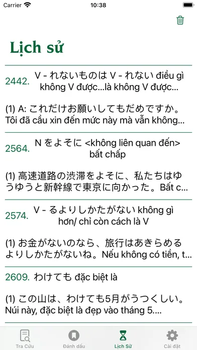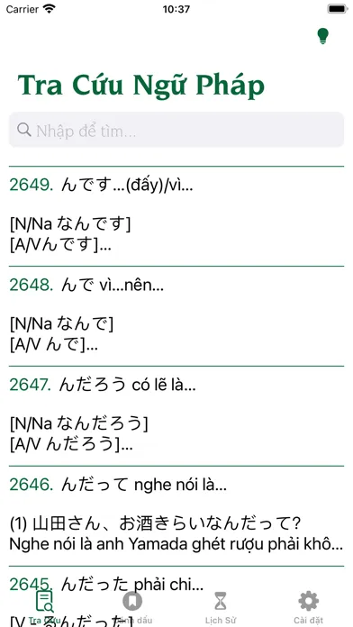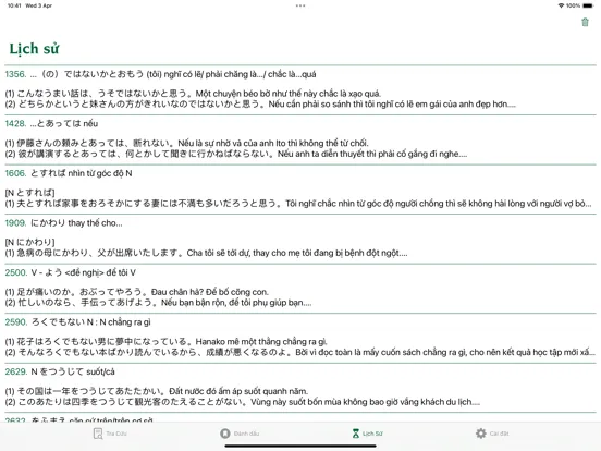 Chương trình có chức năng tìm kiếm, đánh dấu, xem lại lịch sử những mẫu ngữ pháp đã xem.