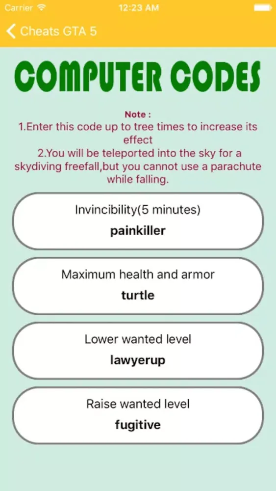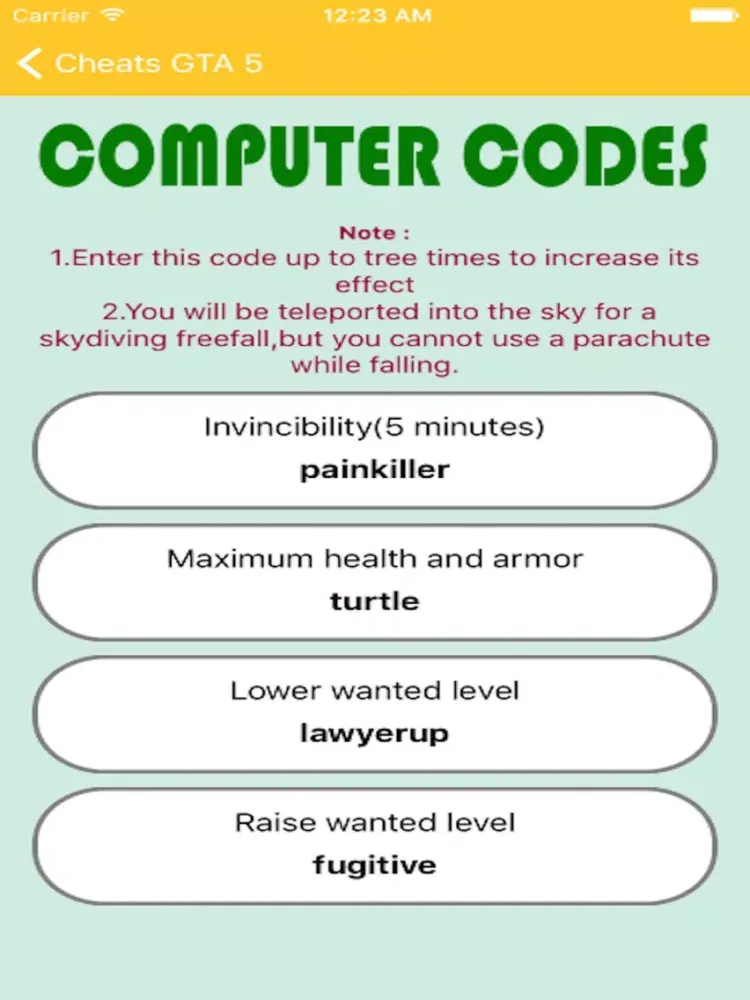 The GTA 5 Cheats in this app used must be physically entered every single time.