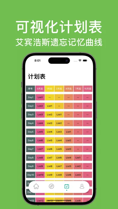 List记单词按照艾宾浩斯遗忘曲线,会智能的帮你自动生成一份复习计划表,你所需要做的就是按照计划表执行即可