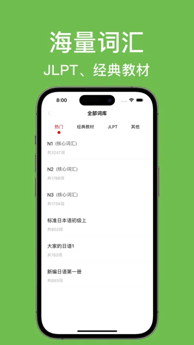 满足不同学习需要,包含:N1,N2,N3,N4,N5,标日初级上,标日初级下,标日高级上,标日高级下,大家的日语1,大家的日语2,新编日语第一册,新编日语第二册,新编日语第三册,新编日语第四册等词汇。
