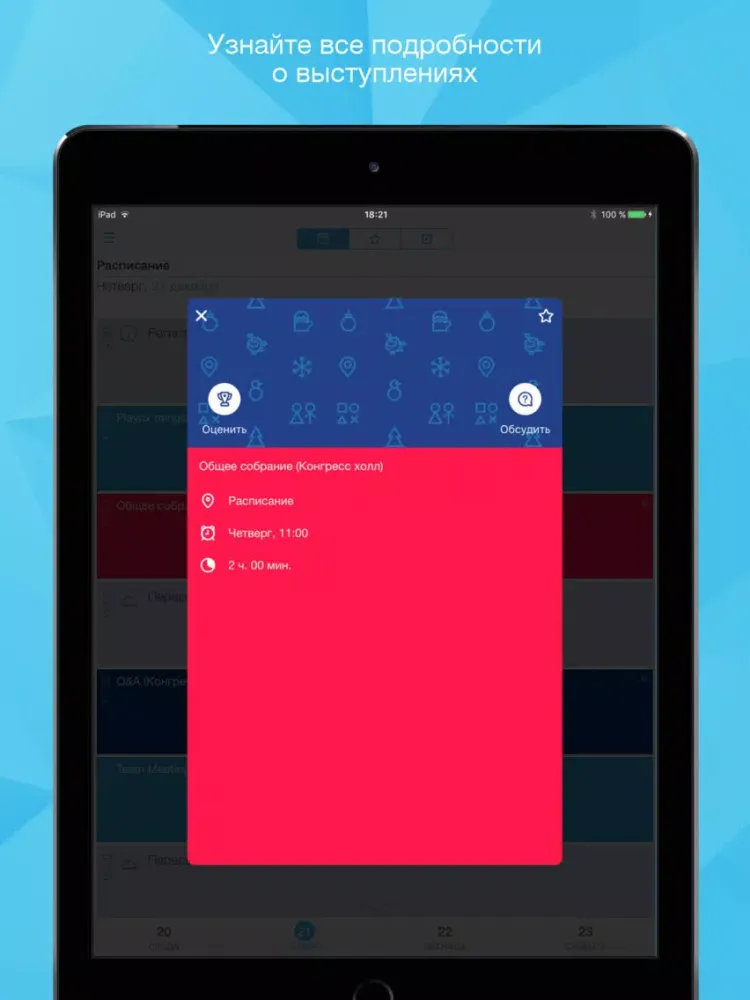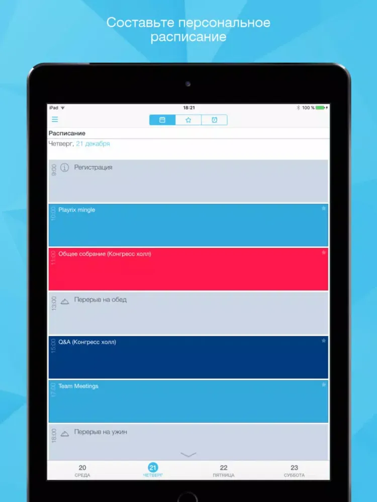 - составить собственную программу и получать оповещения о начале избранных докладов,