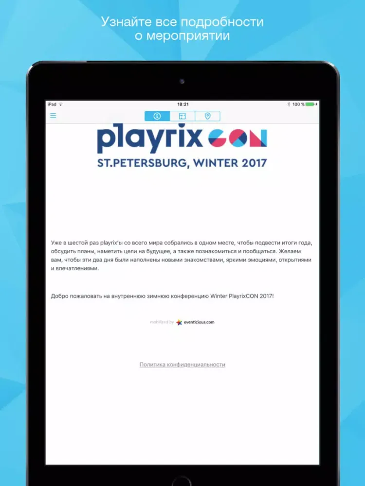 Официальное приложение зимней конференции PlayrixCON (21-22 декабря 2017 года).