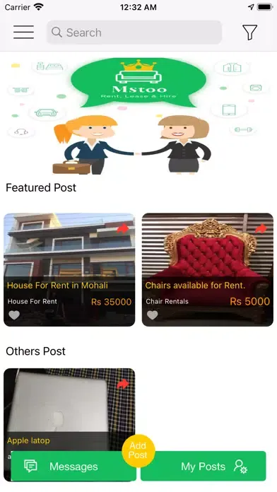 Mstoo is a leading rental app to Rent, Lease and Hire items. The leasing app allows its users to lend or borrow resources for short term hiring need. Get your desired item by simply posting your requirements or search from the feeds for the specific feature you are looking for. Our aim is to help users in connecting to each other for rent or lease resources and hiring for skilled services. The app offers wide variety of rental resources within categories like property, furniture, tools and equipments, vehicles, electronic appliances, smart phones, clothing items and much more.