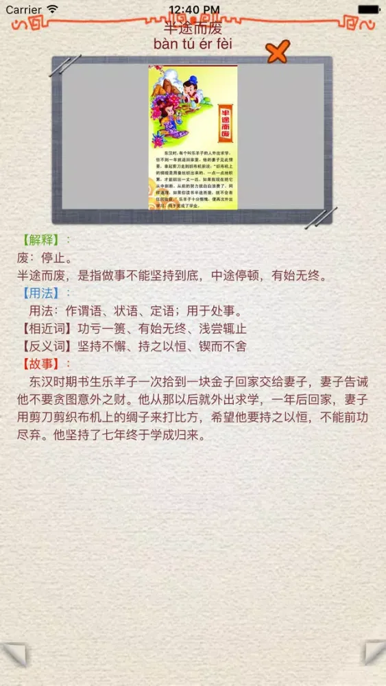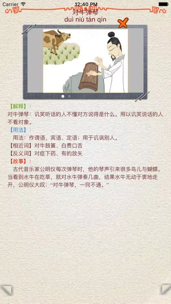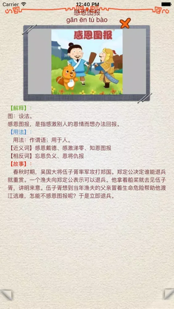 2. 每则成语都包括: 解释, 用法, 近义词/反义词和成语故事的介绍等;