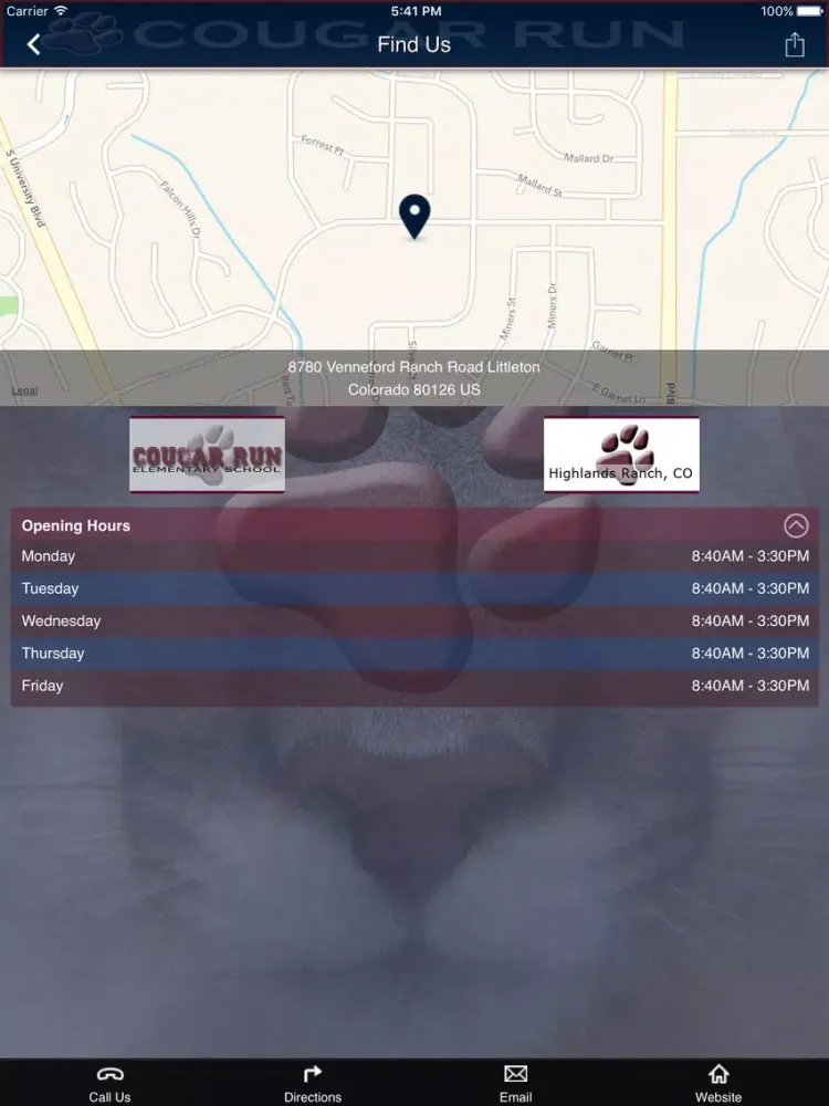 Get the Cougar Run Elementary School mobile app today! Cougar Run Elementary School is a public school, grades PreK-6, located in Highlands Ranch, CO and is part of the Douglas County School District. Whether you are a parent, faculty member, or member of the Highlands Ranch community you will find helpful information in the Cougar Run app.