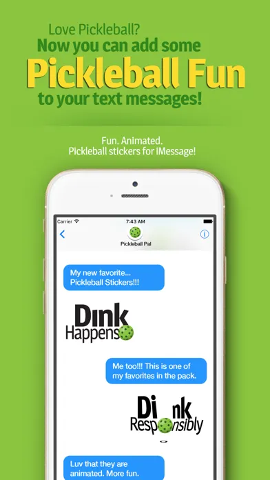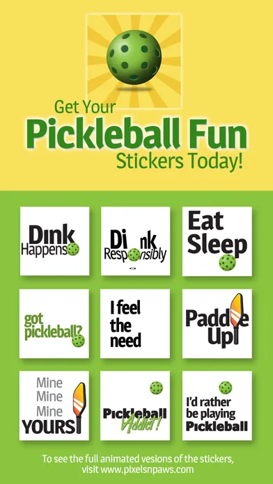Share your love of Pickleball off the court by adding these animated, Pickleball Fun slogans in to your chats. Stickers can be scaled, rotated and you can even layer them - put them on top of photos you send and receive. Ready? Zero, Zero, Start!