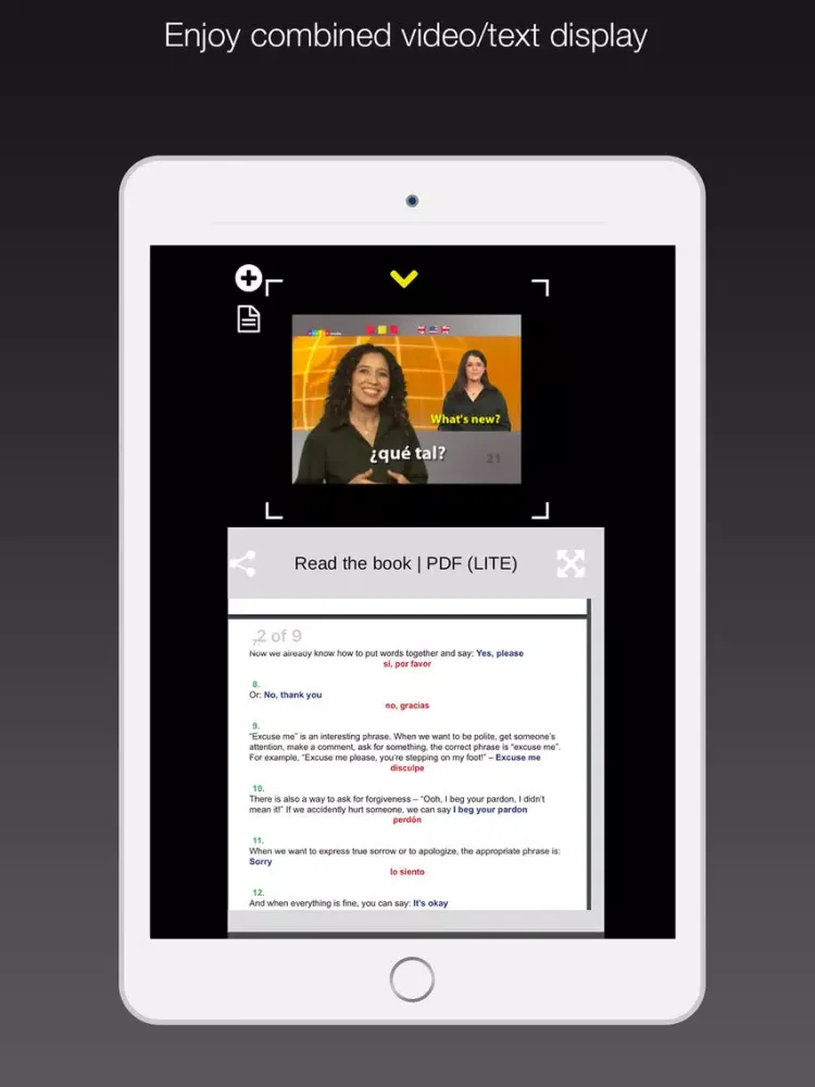 - watch or listen to videos simultaneously with the written texts (where enabled)