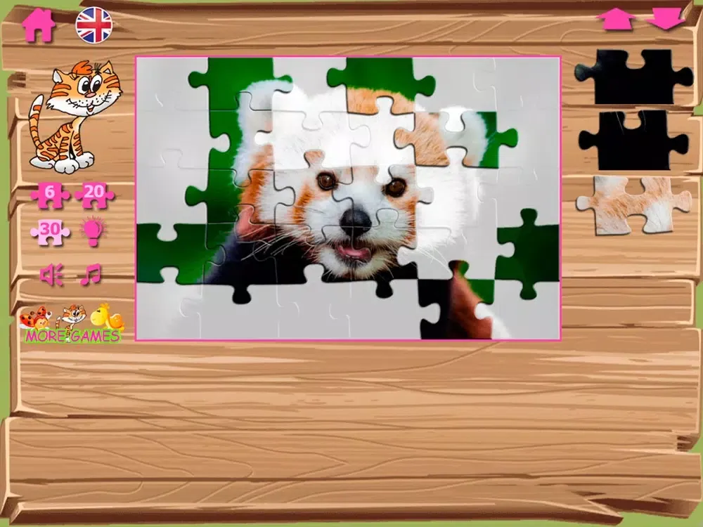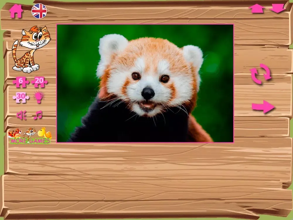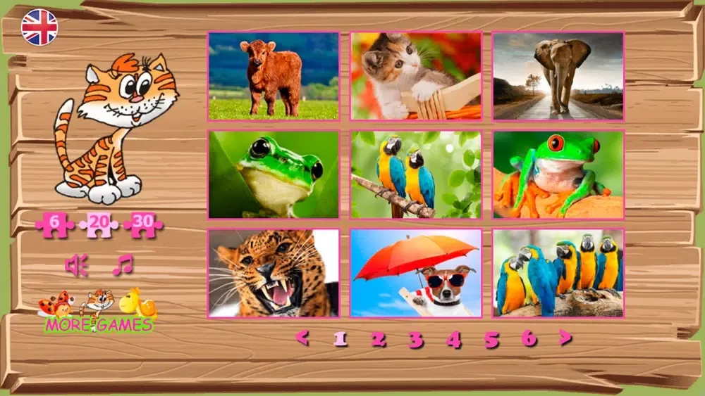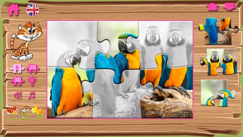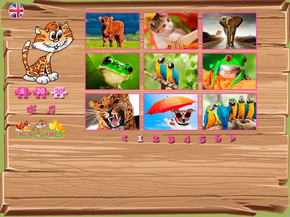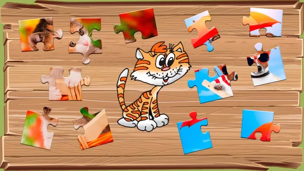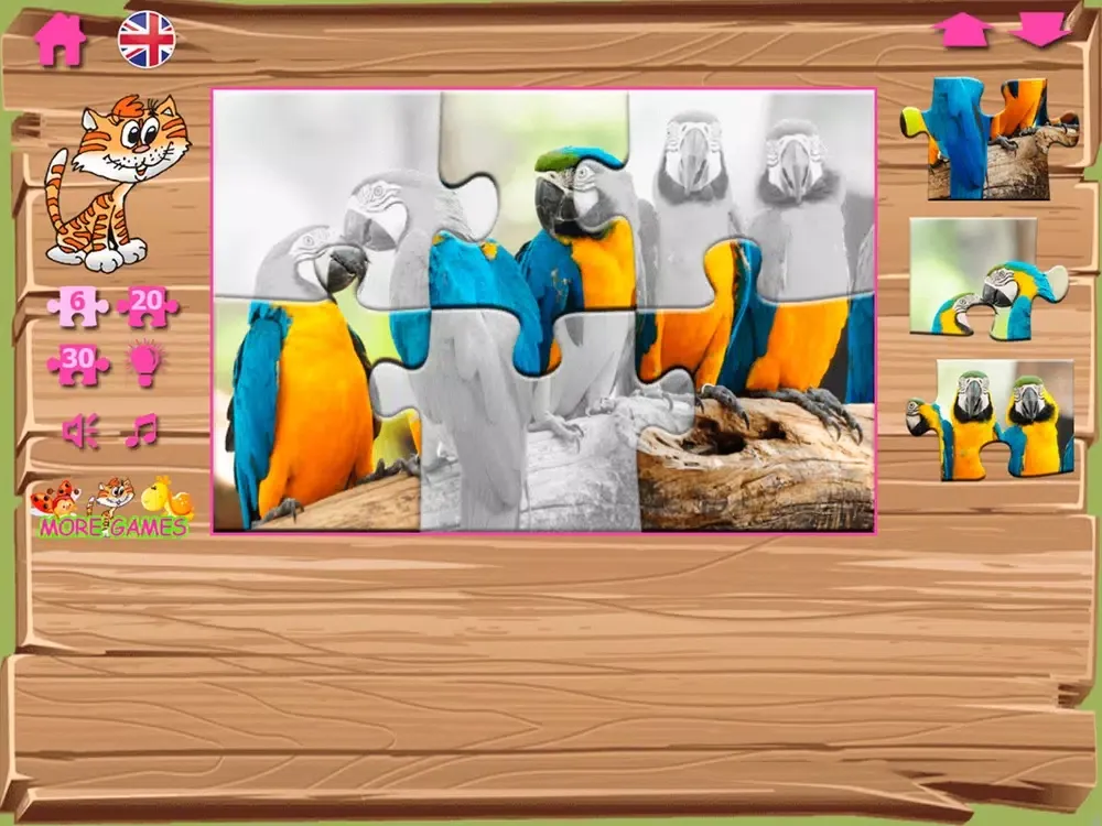 Puzzles contain pictures with the image of different animals and birds. Bright multi-colored parrots, the smiling frogs and even a dog under an umbrella! Process of a game is followed by a cheerful melody and sounds. In case the player collects puzzles correctly, he is praised: you are a good fellow, the clear head, at you turns out.