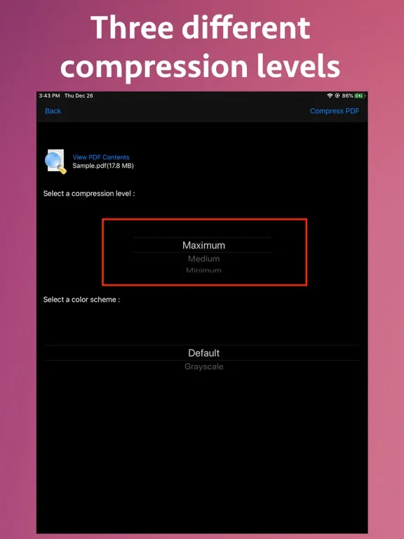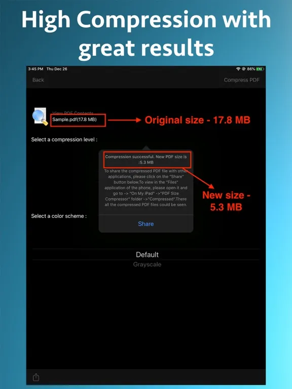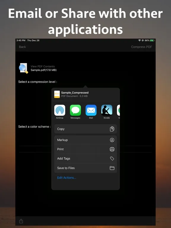 Compress your PDF files using multiple compression options to get a combination of prefect quality and file size which is great for uploading files to the web, sharing with the other applications and sending it through email on mobile phones.