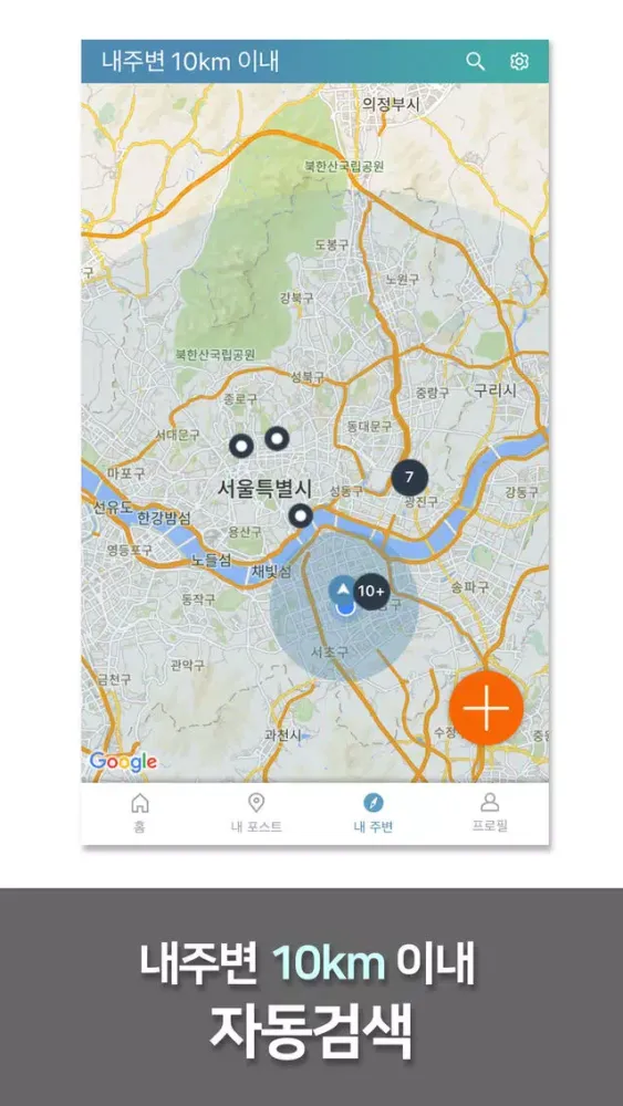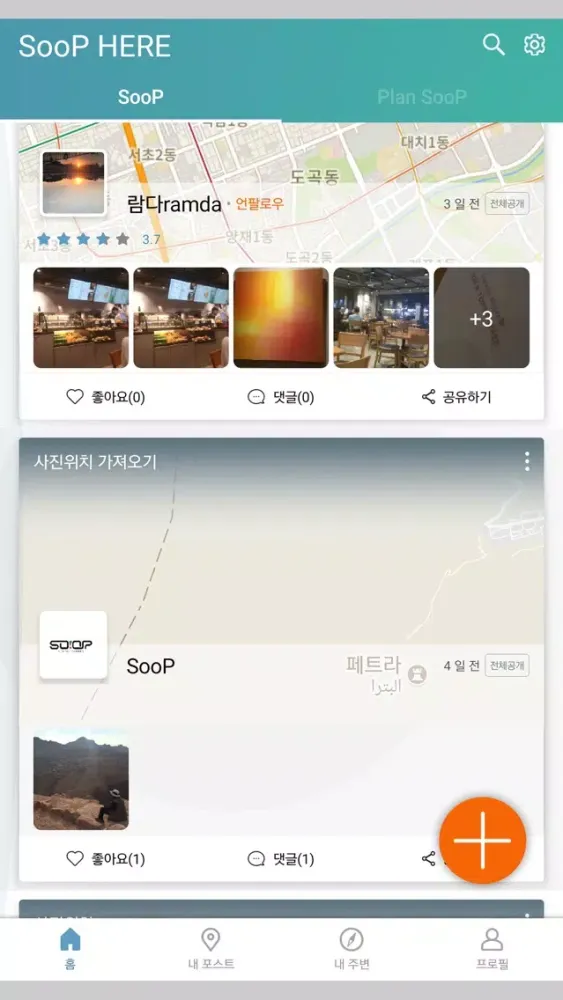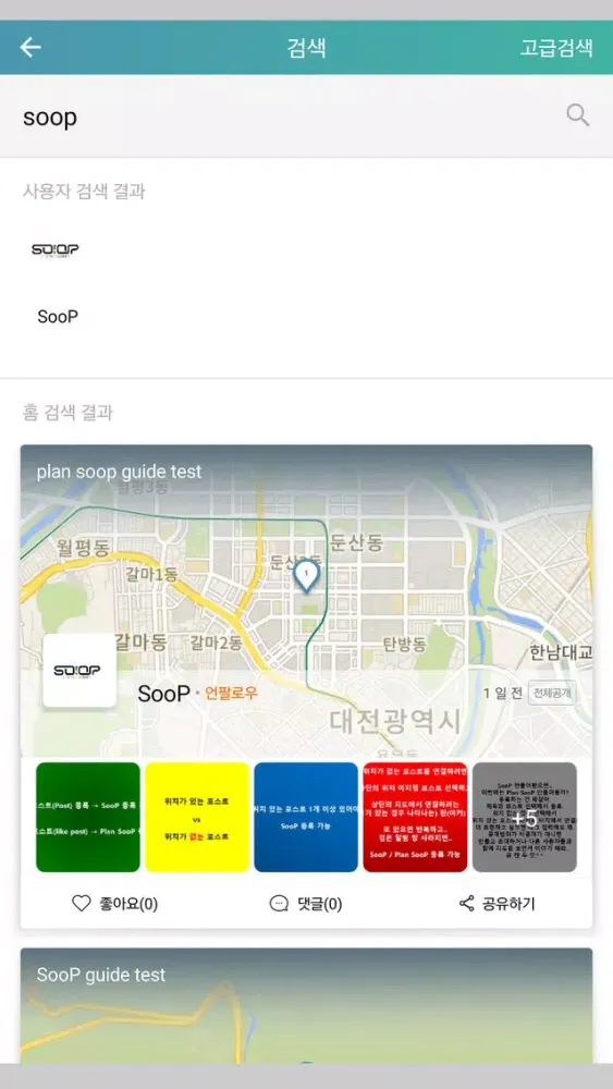 4) 내주변 10km 이내 포스트를 지도에서 검색할 수 있습니다. 검색에서 사용자/SooP/Plan SooP/Post 모두 키워드별로 검색할 수 있으며, 고급검색으로 특정 정보를 쉽게 찾을 수 있습니다.
