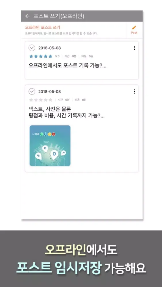 1) 포스트에서 위치, 사진/비디오, 텍스트뿐만 아니라 평점/비용/시간 등 옵션 정보도 함께 기록할 수 있습니다. 포스트는 SooP으로 공유하지 않으면 검색에도 노출되지 않는 나만의 데이터입니다. 좋아요 포스트는 내포스트에서도 가능합니다. 포스트 쓰기 시 위치를 검색해서 지정하거나 현위치를 지정할 수 있습니다. 위치를 포함하는 카메라 기능이 있는 기기를 보유한 경우 사진위치를 가져올 수 있습니다. 온라인뿐만 아니라, 오프라인에서도 포스트 쓰기가 가능합니다. 설정<환경설정<오프라인 모드 설정에서 기능을 활성화하면 사용 가능합니다.