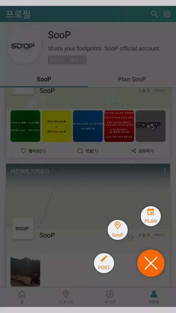 3) 내포스트를 SooP으로 만들었다면, 좋아요포스트를 Plan SooP를 만드는게 차이일 뿐 등록 과정은 거의 유사합니다. Plan SooP에서는 팔로워 공개인 경우 팔로워들을 초대하여 그룹별 의사소통이 가능하며, 전체공개인 경우 새로운 사람들과 함께 Plan SooP을 공유하며 메시지를 주고 받을 수 있습니다.