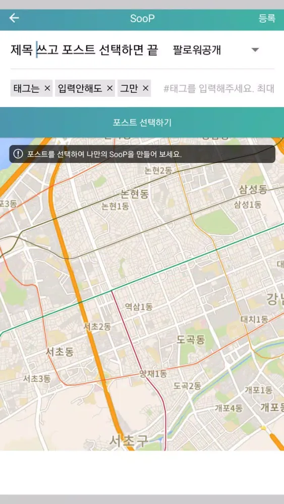 2) 1개 이상의 위치가 있는 포스트를 SooP으로 등록 가능합니다. 위치가 없는 포스트도 연결해서 장소에 대한 스토리텔링을 자유롭게 할 수 있습니다. 제목과 공개범위(전체공개/팔로워공개/비공개) 설정, 포스트 선택하기에서 지도에 연결하고 싶은 포스트를 순서대로 터치해서 등록하면 끝! 제목만으로 지도를 설명하기에 아쉽다면 태그도 추가하여 다른 이들과 함께 공유해 보세요. 카카오톡, 페이스북, 인스타그램, 트위터에서 모두 공유 가능합니다. SooP 등록 < 포스트 선택하기 에서 위치가 없는 포스트도 연결해서 등록하고 싶으면 상단 지도의 위치가 있는 포스트에 대한 핀(마커)를 터치해서 연결할 수 있습니다.