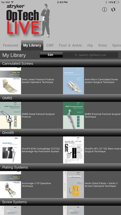Op Tech Live is an iPad app designed to provide orthopaedic specialists with easy access to the latest Stryker Orthopaedics surgical techniques through an intuitive, user friendly touch screen interface. Products lines include extremities, hip, knee, sports medicine, and trauma.